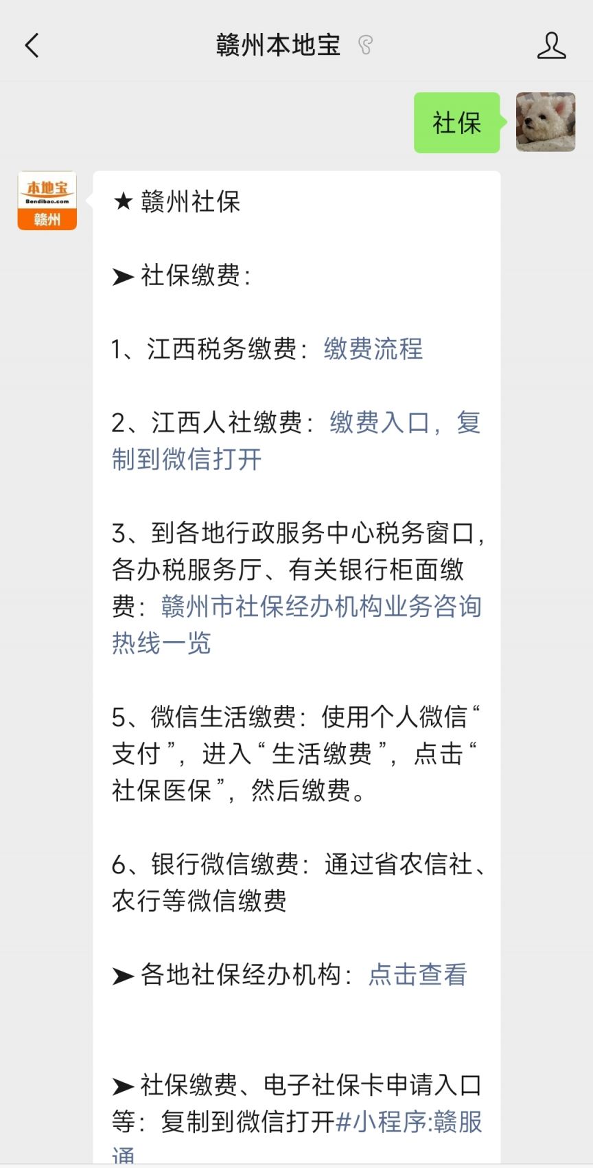 温馨提示:微信搜索公众号赣州本地宝,关注后在对话框回复【社保】即可获取赣州社保缴费入口、缴费流程、机构电话、缴费证明及其他社保业务办理攻略。