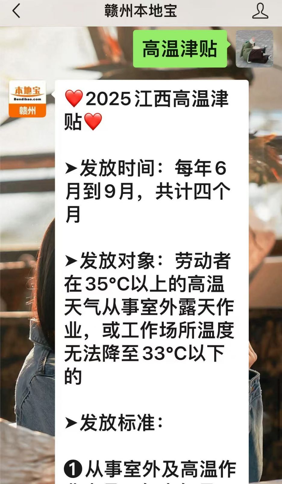 温馨提示:微信搜索微信公众号【赣州本地宝】,关注后在对话框回复【高温津贴】即可获得江西2025高温津贴发放时间、标准等信息。